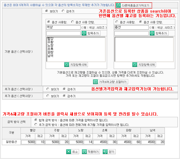 ±âÁ¸¿É¼ÇÀ¸·Î µî·ÏÇÑ »óǰÀ» searchÇÏ¿© Çѹø¿¡ ¿É¼Çº° Àç°í¸¦ µî·ÏÇÏ´Â ±â´Éµµ ÇÔ²²