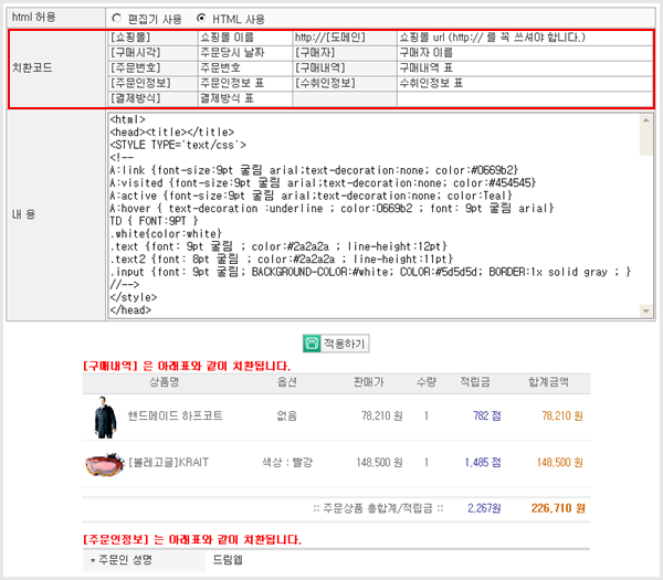 - ÁÖ¹®½Ã ÀÚµ¿¹ß¼ÛµÇ´Â ¸ÞÀÏ¿¡ ´ëÇØ 2¹øÀÇ Ä¡È¯ÄÚµå¹æ½ÄÀ¸·Î °ü¸®ÀÚ°¡ Á÷Á¢ ¼öÁ¤ÀÌ °¡´ÉÇϵµ·Ï