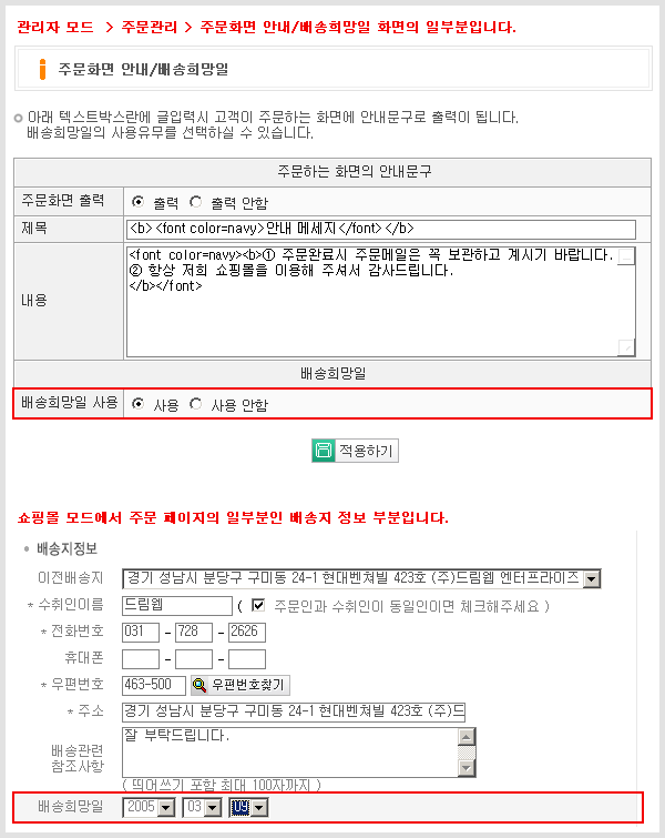¹è¼ÛÈñ¸ÁÀÏ ±â´ÉÀº ¿É¼Ç»çÇ×À¸·Î °ü¸®ÀÚȸé ÁÖ¹®°ü¸®--> 3¹øÂ°.ÁÖ¹®È¸é¾È³»/¹è¼ÛÈñ¸ÁÀÏ