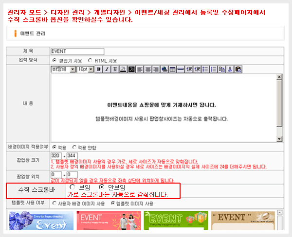 µî·Ï,¼öÁ¤½Ã »õ·Î »ý¼ºµÈ ¼öÁ÷ ½ºÅ©·Ñ¹Ù ¿É¼ÇÀ» ÅëÇØ ¼³Á¤°¡´ÉÇÕ´Ï´Ù.