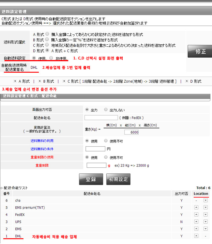 °ü¸®ÀÚ ¼³Á¤ --> ==>Cû¡ãÒ / Dû¡ãÒ »ç¿ë½Ã ÀÚµ¿¹è¼Û ¼±ÅÃ¿É¼Ç Ãâ·Â ( í»ÔÑáêÖùàâïÒ ) ÀÚµ¿ ¹è¼Ûºñ Ãß°¡ ¼³Á¤
