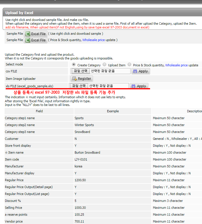 ¼öÁ¤ »çÇ× xls ÆÄÀÏÀº ¾ð¾îÁö¿ø°¡´É °ü¸®ÀÚ¼³Á¤ --> ==>xls FILE (excel_goods_sample.xls) ÆÄÀÏ ¾÷·Îµå ±â´É Ãß°¡